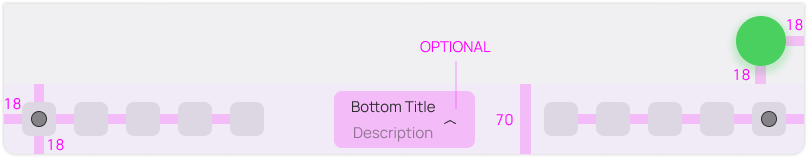 The Bottom Bar is 70 units tall, and houses 5 action buttons total per side, reserving the center for the title and description. This center widget may also act optionally as a menu. Each action button is spaced 18 from each other.